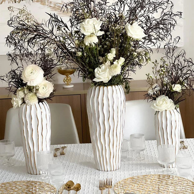 Elegant White Porcelain Vase with Gold Wavy Design